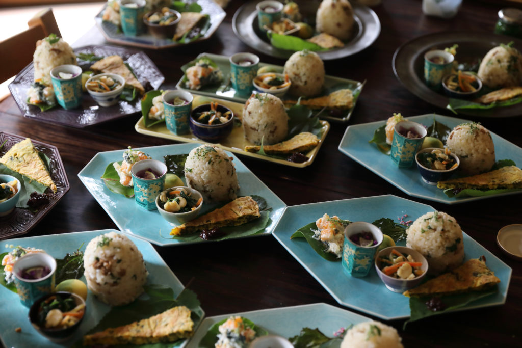 ここで月日星さんの素晴らしい野草点心が登場。この機会だからこそ陽の目を浴びて喜ばしい美しい器たちに盛り込まれ、ズラリ並んだ風景。